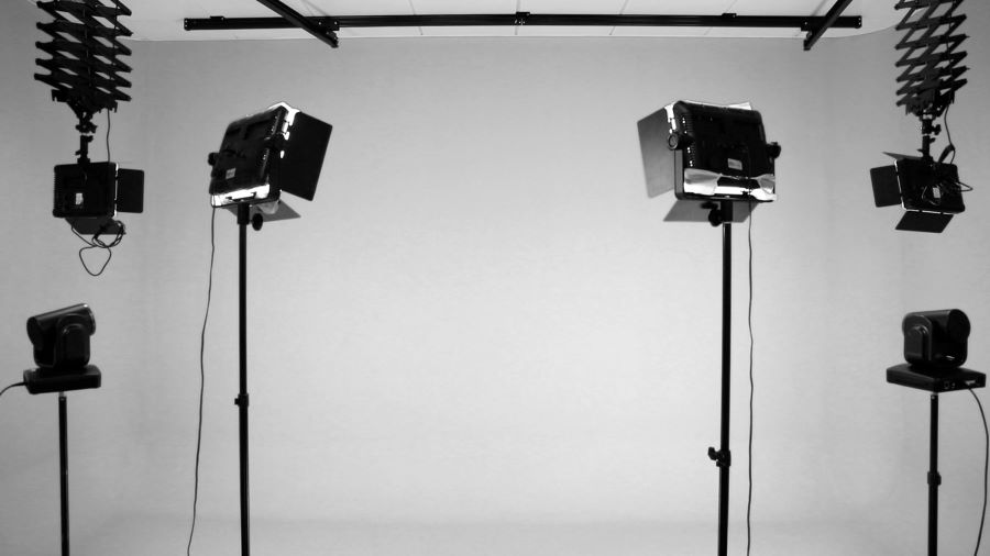 Câmaras, gimbal para estabilização de imagem, chroma key e suporte de leitura de conteúdo em tempo real (teleponto).