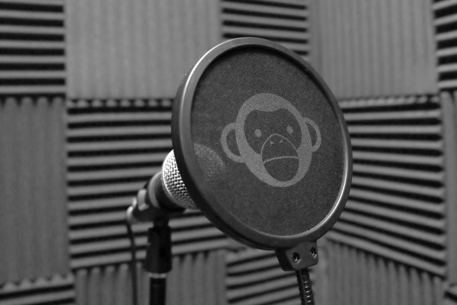 Colunas em estúdio, microfones de lapela, condensadores e direcionais, gravador de áudio e cabine de som insonorizada.